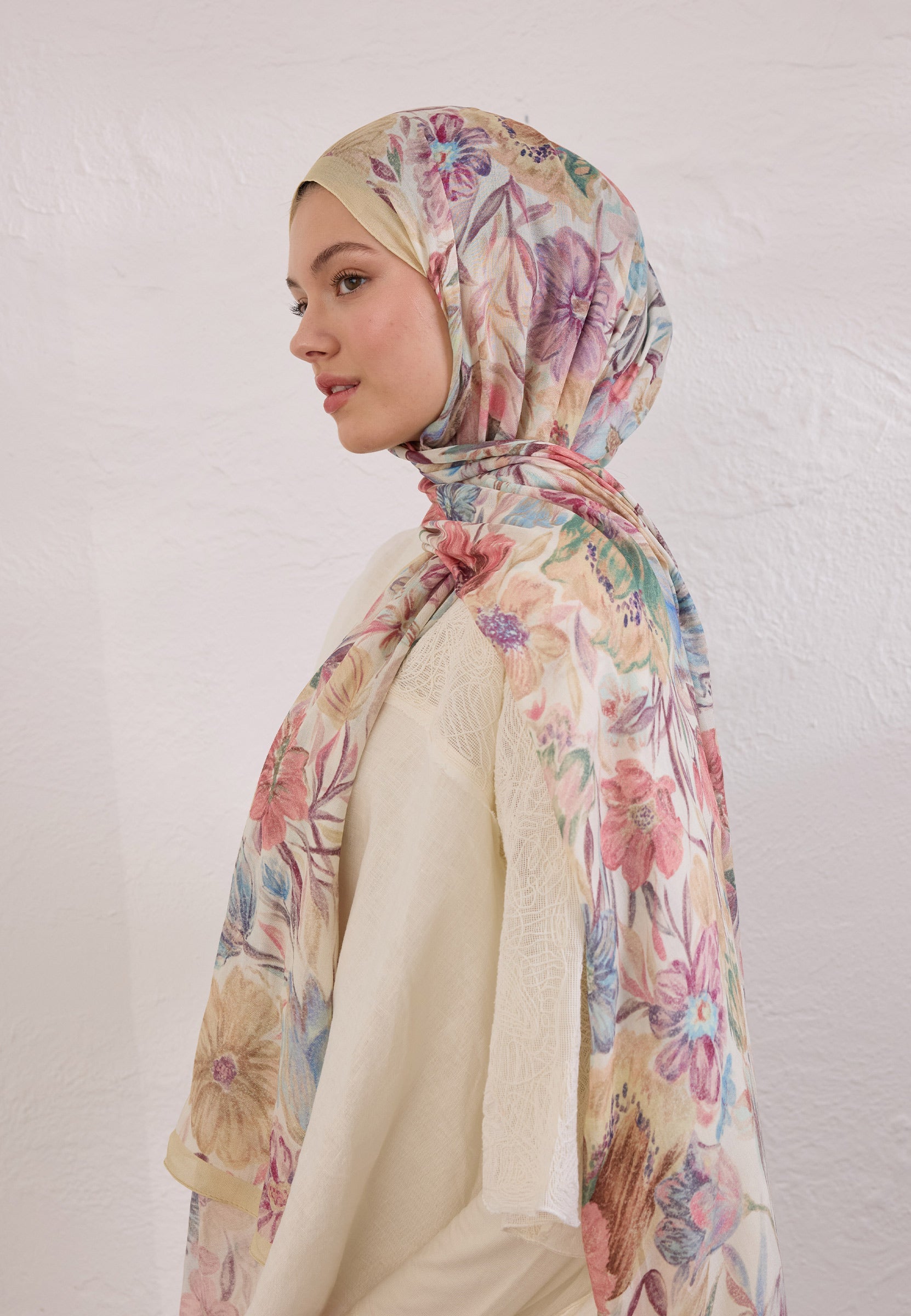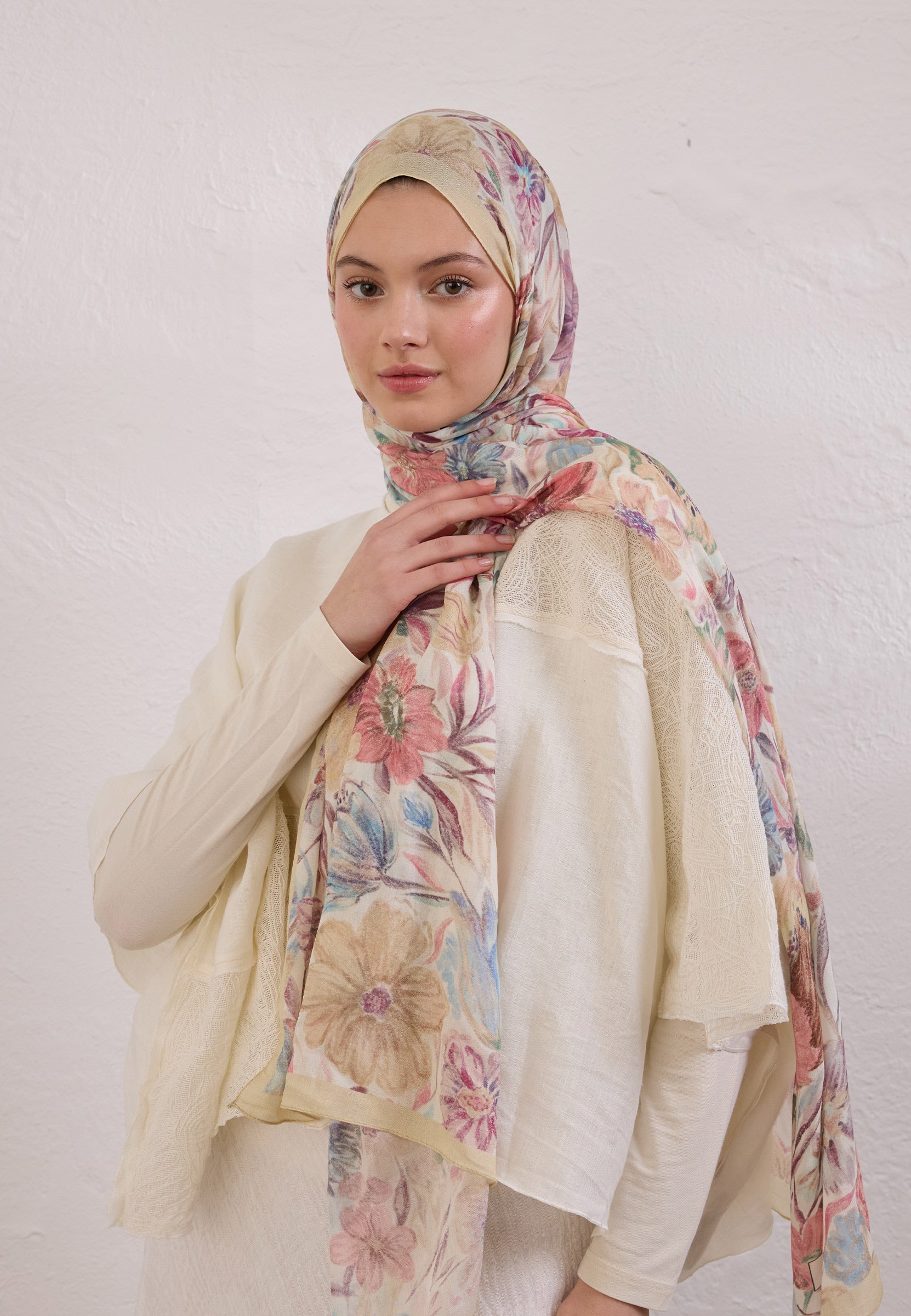 Vintage Garden Patterned Rami Hijab Soft Yellow