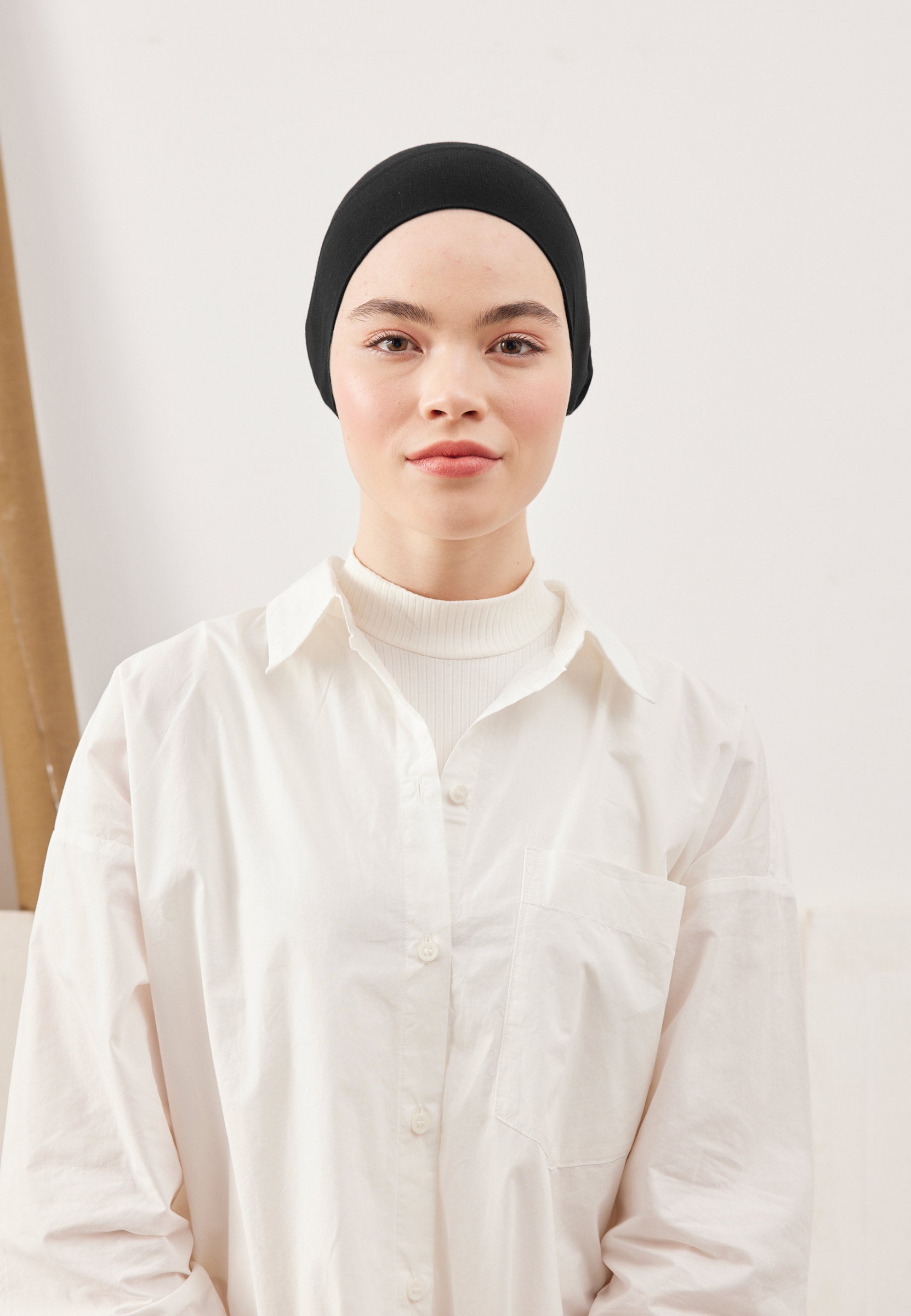 Designed to be worn by passing under the nape and chin, this underscarf offers a secure, slip-free fit that stays comfortably in place all day.