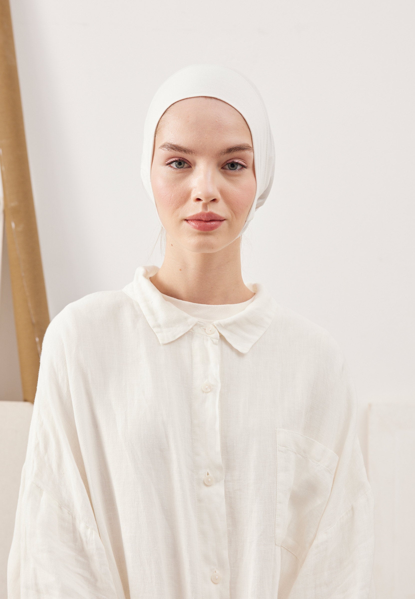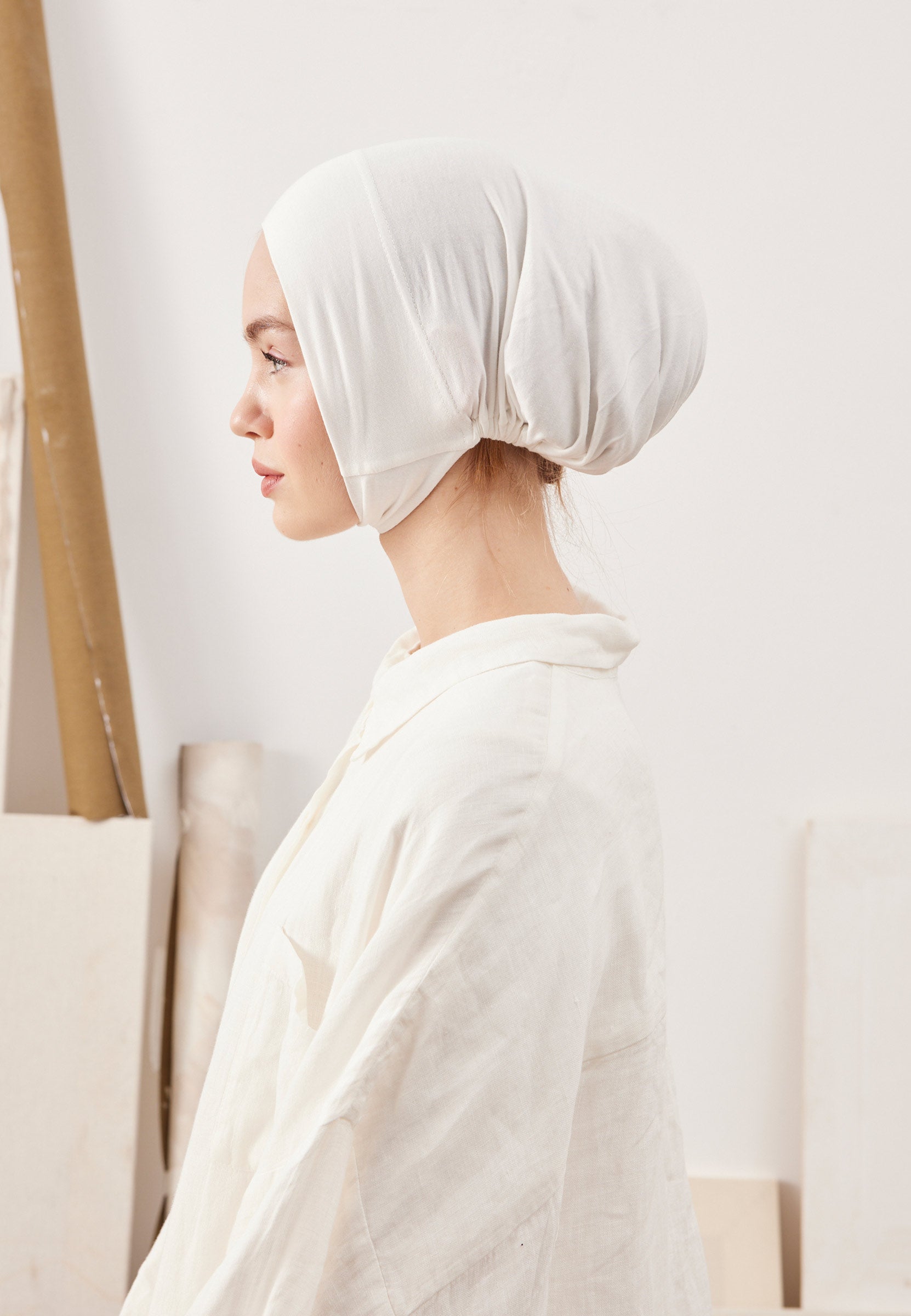 Designed to be worn by passing under the nape and chin, this underscarf offers a secure, slip-free fit that stays comfortably in place all day.