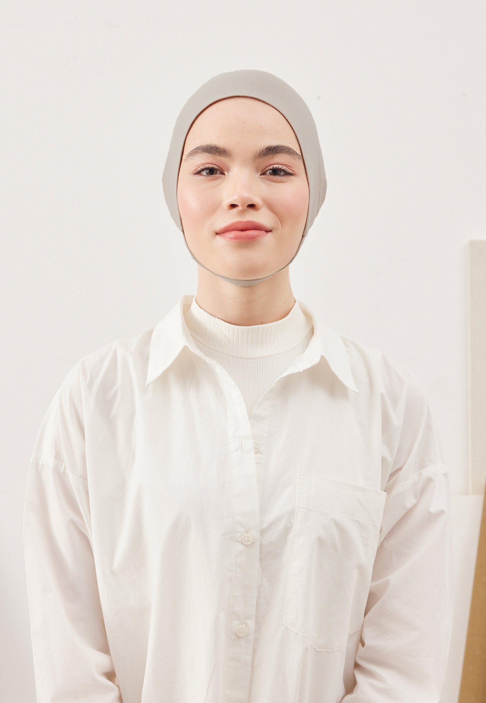 Designed to be worn by passing under the nape and chin, this underscarf offers a secure, slip-free fit that stays comfortably in place all day.