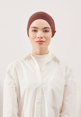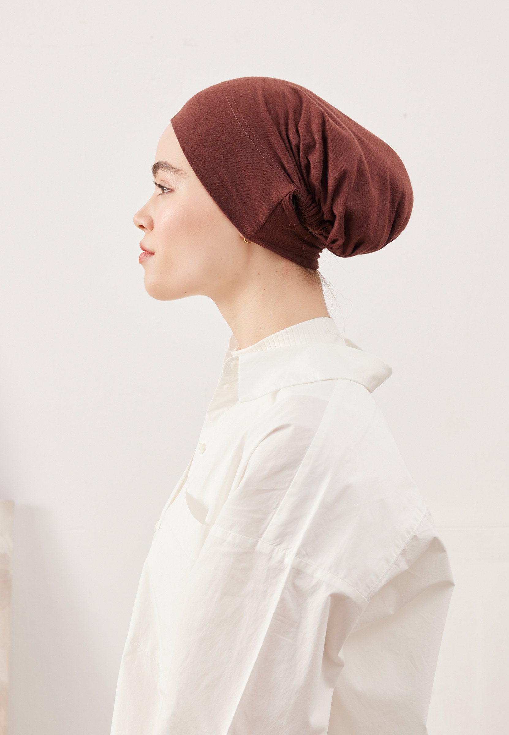 Designed to be worn by passing under the nape and chin, this underscarf offers a secure, slip-free fit that stays comfortably in place all day.