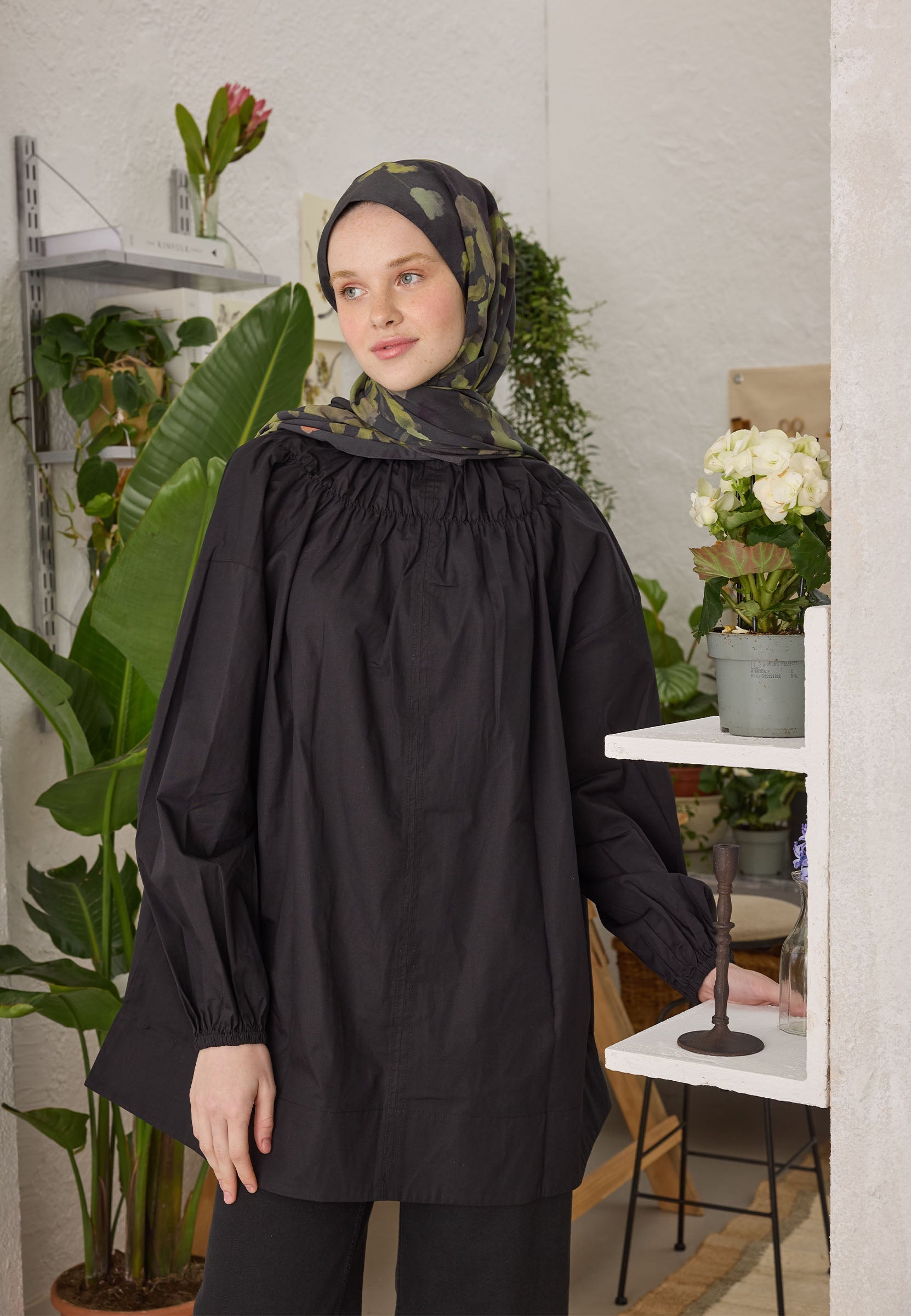 İpeksi modal kumaştan üretilmiştir, her mevsime uygundur. Akışkan ve hafif bir dokuya sahiptir.
