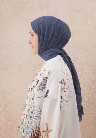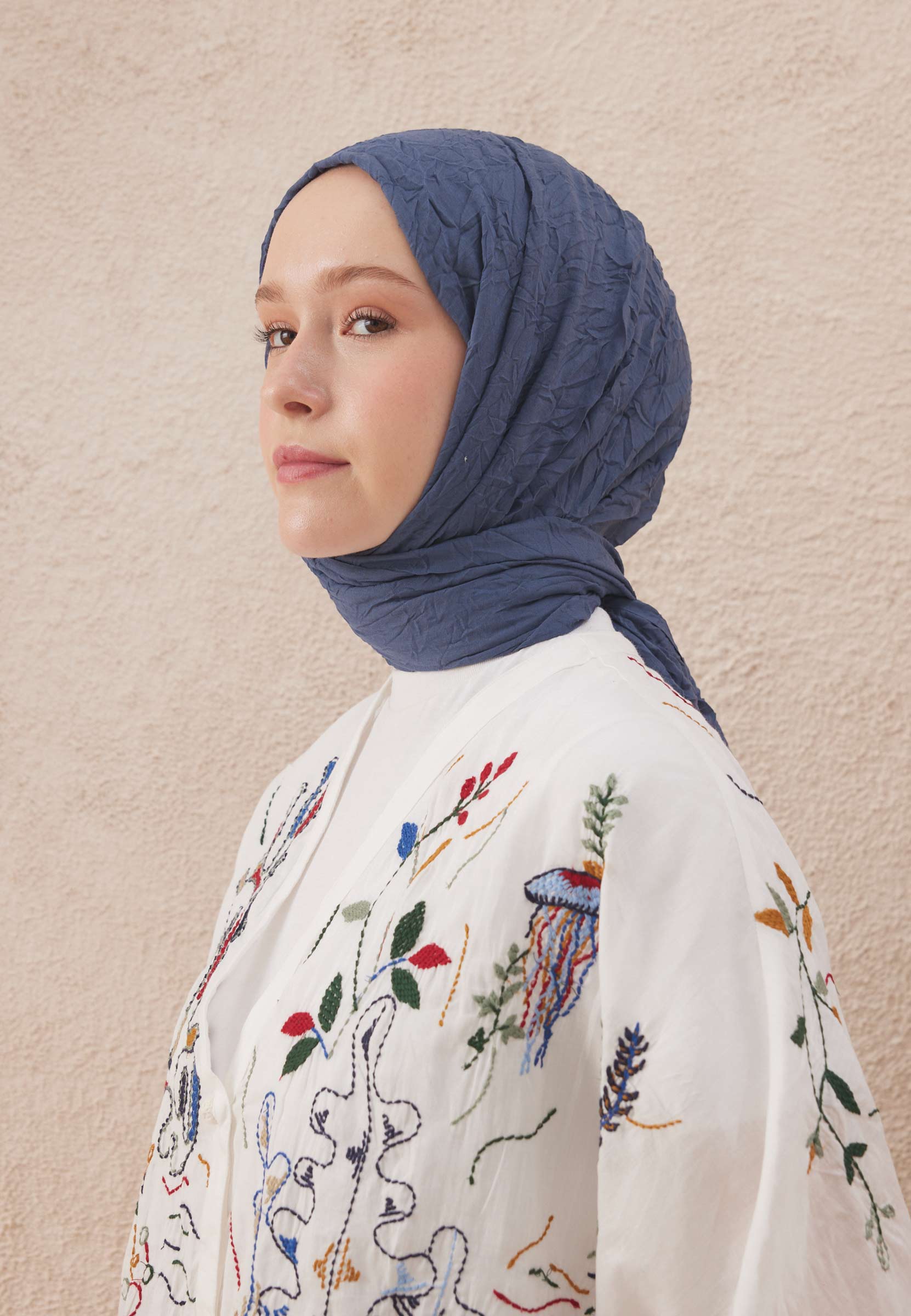 Vual çarpmalı başörtülerimiz organik boyalarla boyanmış olup doğal kırışık bir dokuya sahiptir.